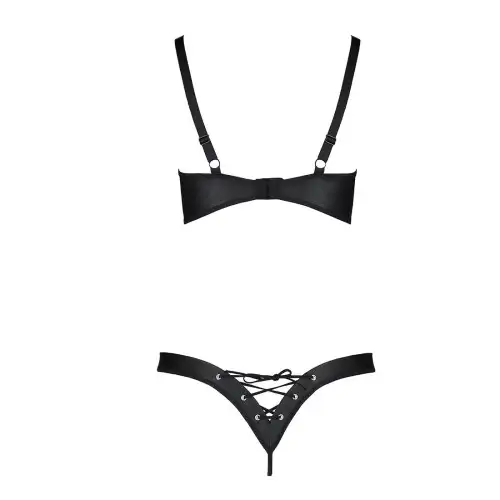 Комплект из экокожи Celine Bikini black L/XL — Passion: открытый бра с лентами, стринги со шнуровкой
