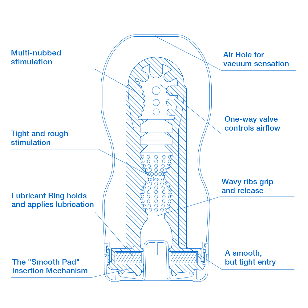Девайс состоит из смазанных силиконовых колец с достаточно сложной структурой. Эти кольца скрыты в главном контейнере. Каждый элемент, расположенный внутри мастурбатора, обладает мягкой рельефной поверхностью. На ней предусмотрено огромное количество выступов, все они имеют разные размеры. Также есть зона для стимуляции головки, стимулирующие складки, ребра. Кольца плотно, и одновременно нежно, обхватывают половой член.
