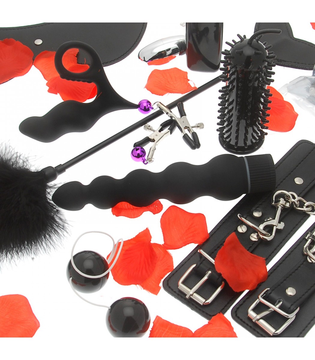 В комплект входит рукав для полового члена, стимулятор простаты, вибрирующее кольцо для члена, вагинальные шарики, вибратор, наручники, вибрирующее яйцо, зажимы для сосков, маска, щекотливое перо и искусственные лепестки роз. С таким широким ассортиментом игрушек и аксессуаров в вашем распоряжении вы сможете экспериментировать с различными ощущениями и найти то, что лучше всего подходит для вас.