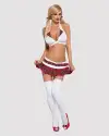 Этот костюм включает в себя белое платье медсестры с красной отделкой, соответствующий головной убор и пару белых чулок. Платье имеет открытую спину и регулируемые бретели, которые позволяют легко подогнать фигуру по фигуре. Головной убор добавляет нотку озорства, а чулки завершают образ.