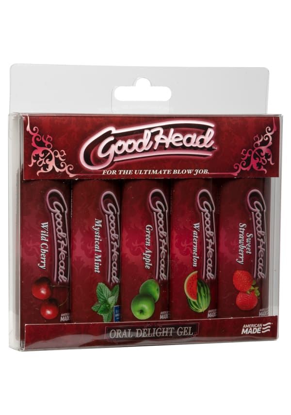 Doc Johnson GoodHead Oral Sex Gel Set — набор из пяти тюбиков по 29 мл вкусных ароматизированных гелей, которые сделают ваш оральный секс еще более приятным. Этот набор включает в себя такие ароматы, как вишня, мята, арбуз, яблоко и клубника, для разнообразия дразнящих вкусов. Каждый тюбик не содержит сахара и парабенов, поэтому вы можете наслаждаться вкусом, не беспокоясь.